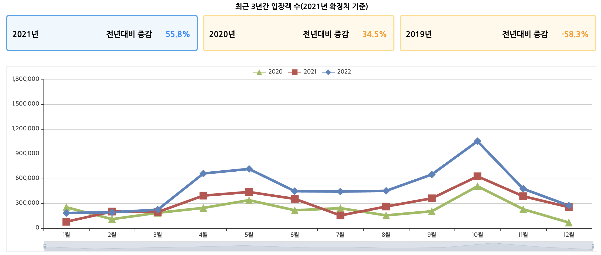 한국문화관광연구원의 관광지식정보시스템에 따르면 에버랜드는 2020년부터 꾸준히 입장객 수의 상승세를 보이고 있으며 입장객 수가 많은 시기는 주로 4-5월과 9-10월 등 봄가을 시기임을 알 수 있다. 또한 지난 해 입장객 수가 가장 많은 관광지로 370만 6000명으로 집계된 에버랜드가 선정되었다.