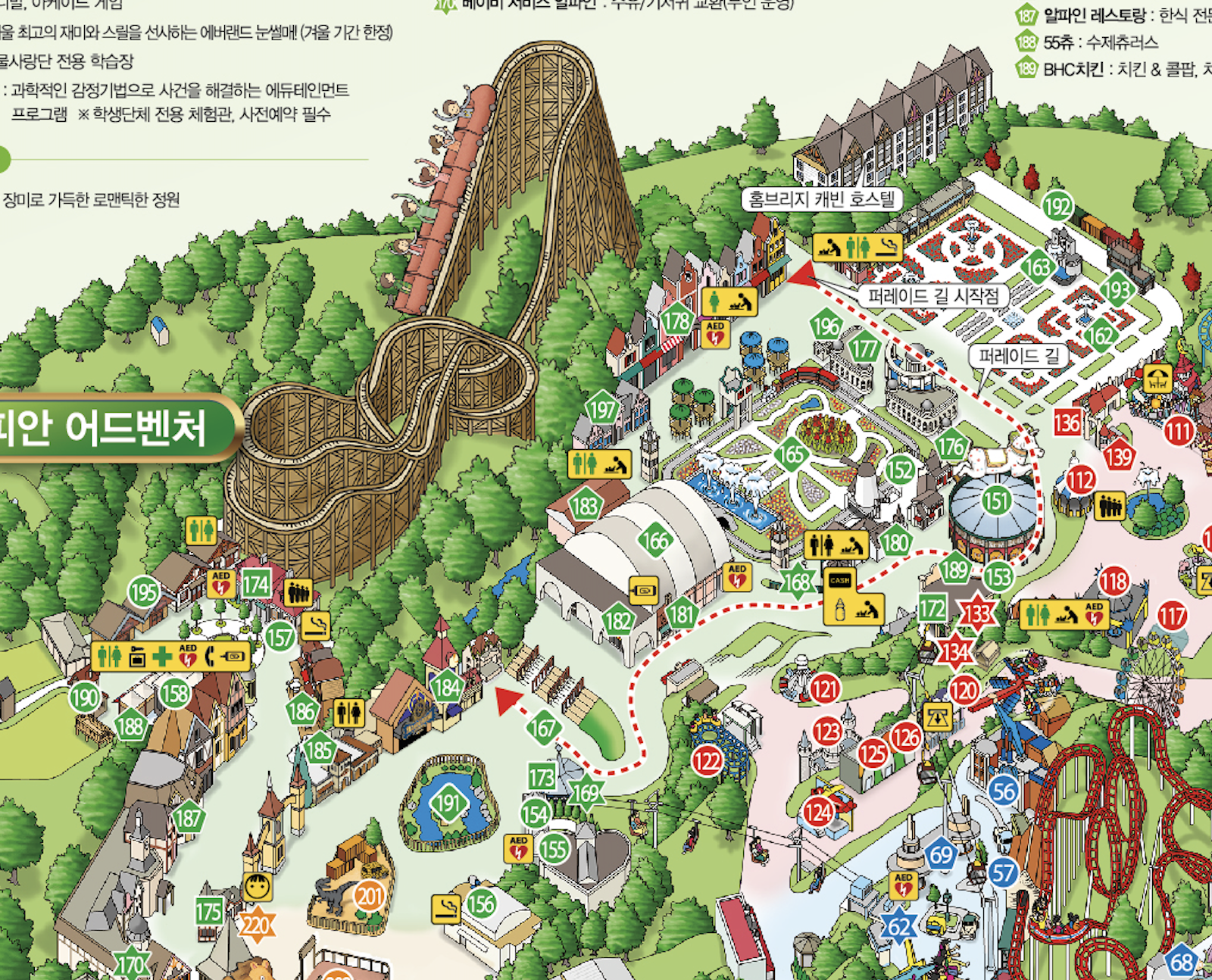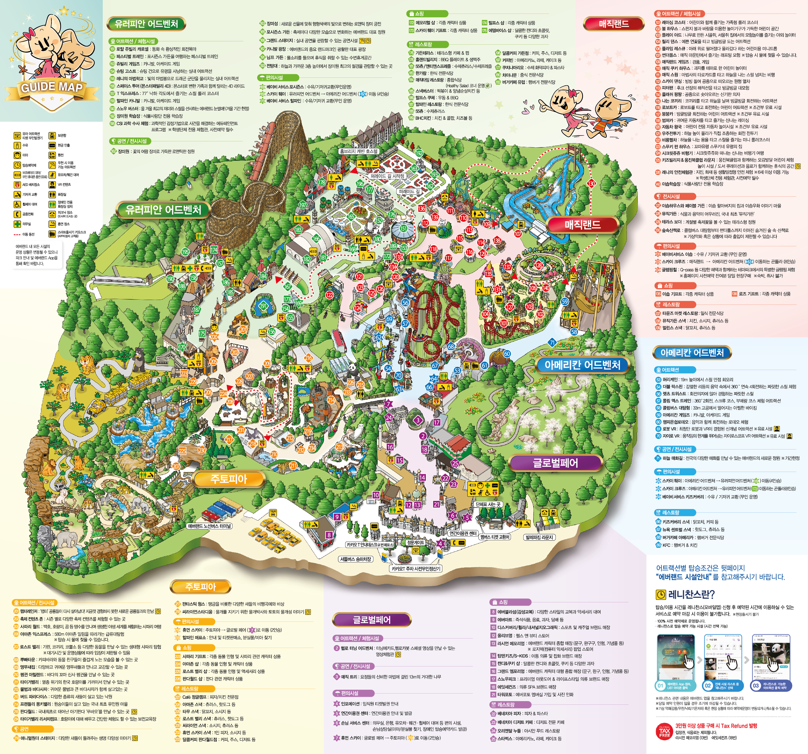 에버랜드는 총 5개의 서로 다른 테마 구역으로 구성되어 있다. 아래의 가이드맵에서 확인할 수 있듯 매표소를 지나 가장 처음 만나는글로벌페어부터아메리칸 어드벤처,매직랜드,유러피안어드벤처,주토피아이다. 이 다섯개의 구역이 각각 어떤 테마를 어떤 방식으로 어떤 시설에 녹여내고 있는지 차근차근 살펴보려 한다. 입장하자마자 만나는 구역부터 방문객의 보편적인 동선인 반시계방향으로 만나보자.