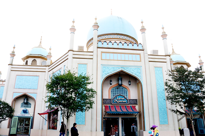 가장 처음 만나는 진입광장, ‘글로벌페어’는 명칭 그대로 ‘전세계의 건축 양식을 따른 다양한 건축물들과 함께 세계적인 문화와 음식, 상품을 경험할 수 있는 공간’이라는 의미를 가진다. 메소포타미아 건축 양식부터 비잔틴, 고딕, 빅토리아, 사라센 등 전 세계의 다양한 건축양식을 적용한 건물들이 모여있는 것을 볼 수 있다.