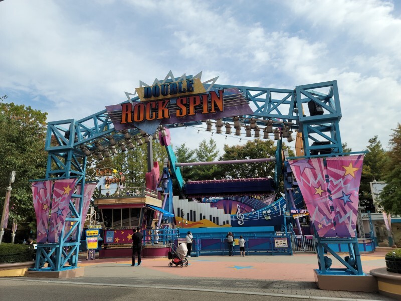 더블 락스핀은 탑스핀이라는 종류의 어트랙션으로, 발이 바닥에 닿지 않는 형태의 좌석에 앉아 빙글빙글 돌아가는 형태이다. 엘비스 프레슬리의 음악을 컨셉으로 하는 구역에 알맞게 그와 연관된 여러 상징물들을 이용한 디자인이 돋보인다. 위 사진에서도 보이듯 어트랙션의 양옆이 기타와 건반으로 독특하게 디자인되어 있으며, 색감 또한 락스빌 거리 전반적으로 통일되는 색상인 분홍색과 파란색이 주로 이루어진 모습을 보인다. 에버랜드 내에서 해당 구역의 테마에 가장 적극적으로 대응하고 있는 어트랙션중 하나가 아닐까 생각해본다.