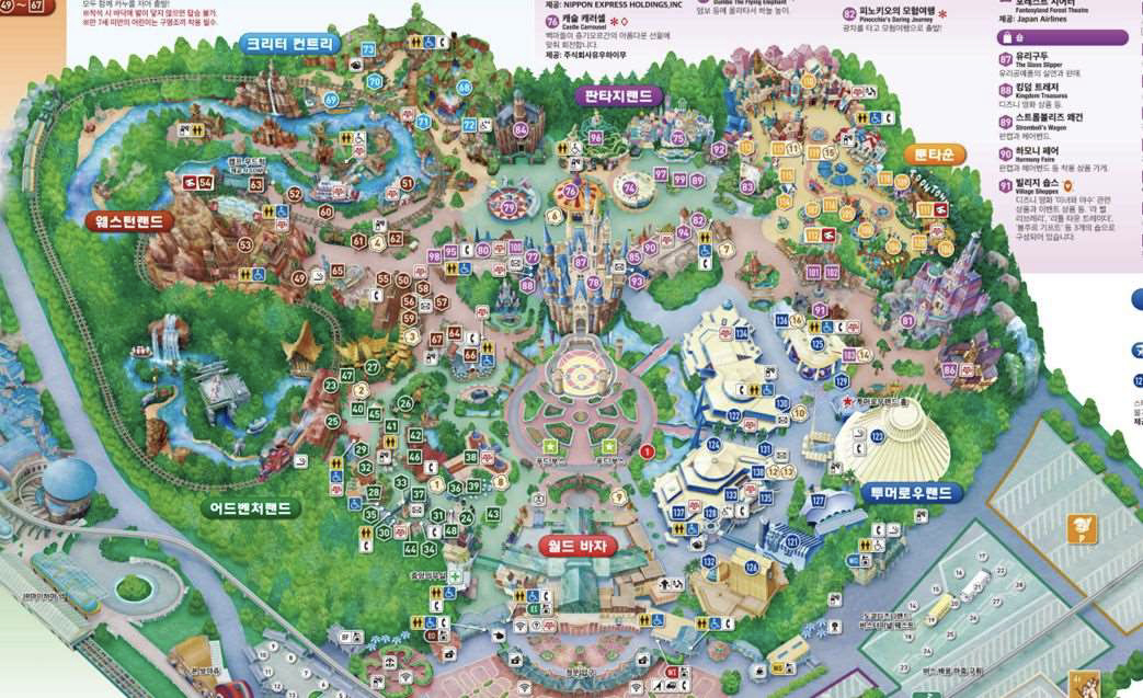 또한 이 구역은 컨셉 뿐만 아니라 구역의 시작과 끝이 명확히 드러나지 않는다는 단점이 있다고 판단했다. 그렇다면, 도쿄 디즈니랜드처럼 구역마다 바닥의 색을 구분하는 방법을 도입해보면 어떨까? 기존의 파크 구역을 전체적으로 모두 바꿀 수 없는 현실적인 상황을 고려했을 때, 바닥의 색을 구역별로 구분해 칠하기만 해도 그 공간의 변화를 사람들이 직관적으로 경험할 수 있을 것이다. 도쿄 디즈니랜드 가이드맵 _ 구역 별 바닥 색 구분 이와같이 매직랜드는 전반적인 구역 자체의 테마적인 부분에서 아쉬움이 느껴지는 구역이었다.