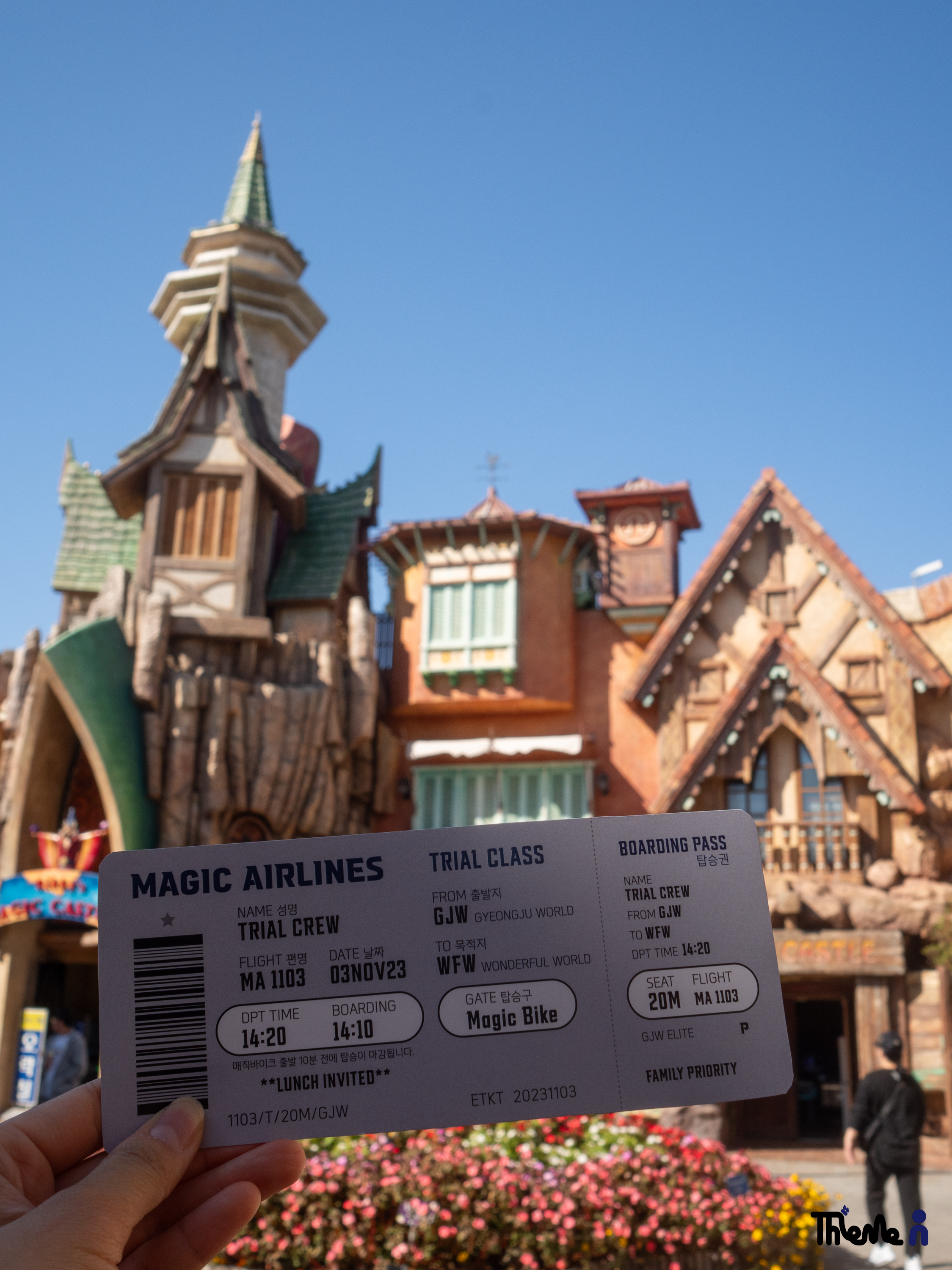 경주월드에서 출발하여 경주월드의 테마송의 배경인 원더풀 월드로 떠나는 항공권이다.