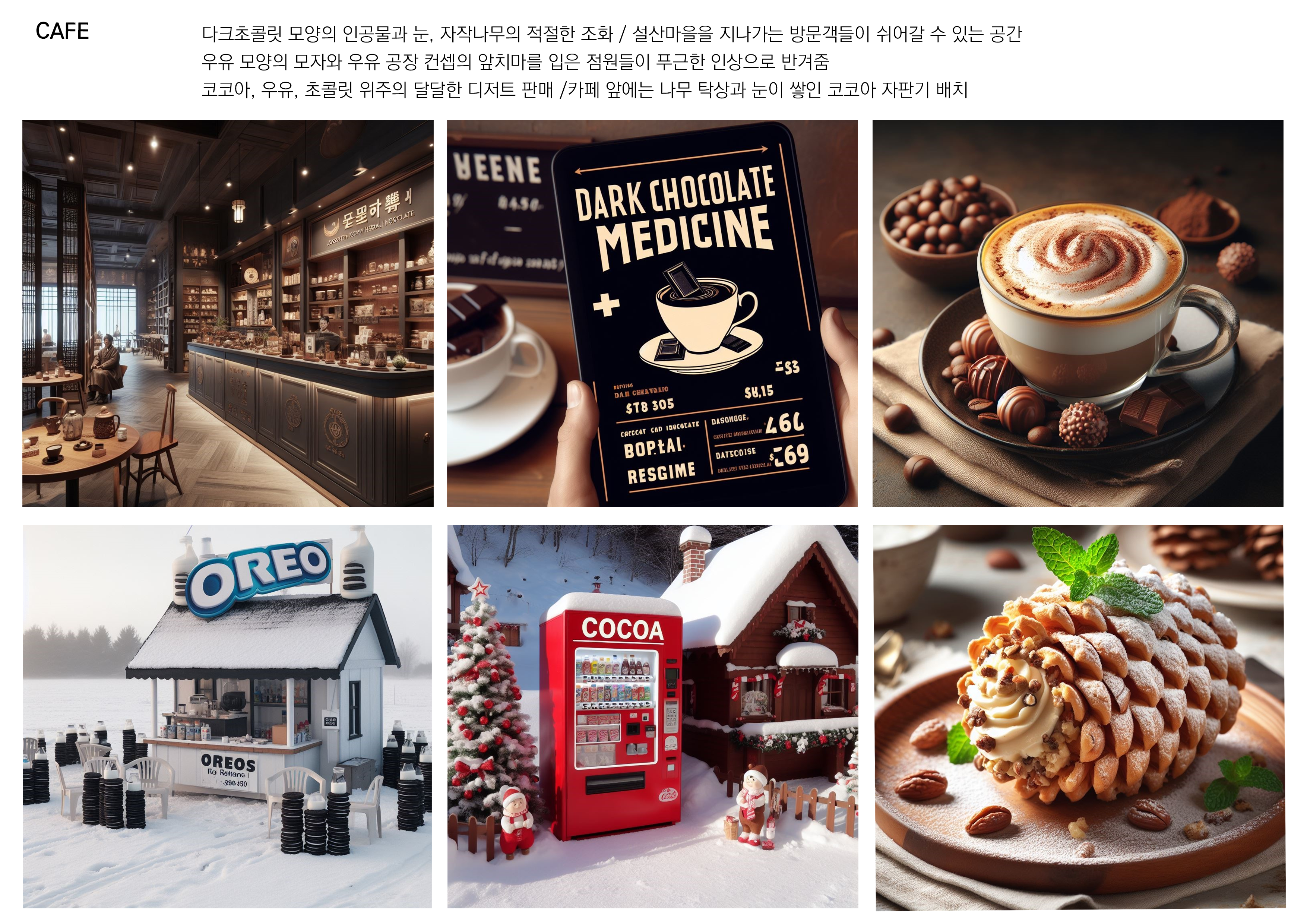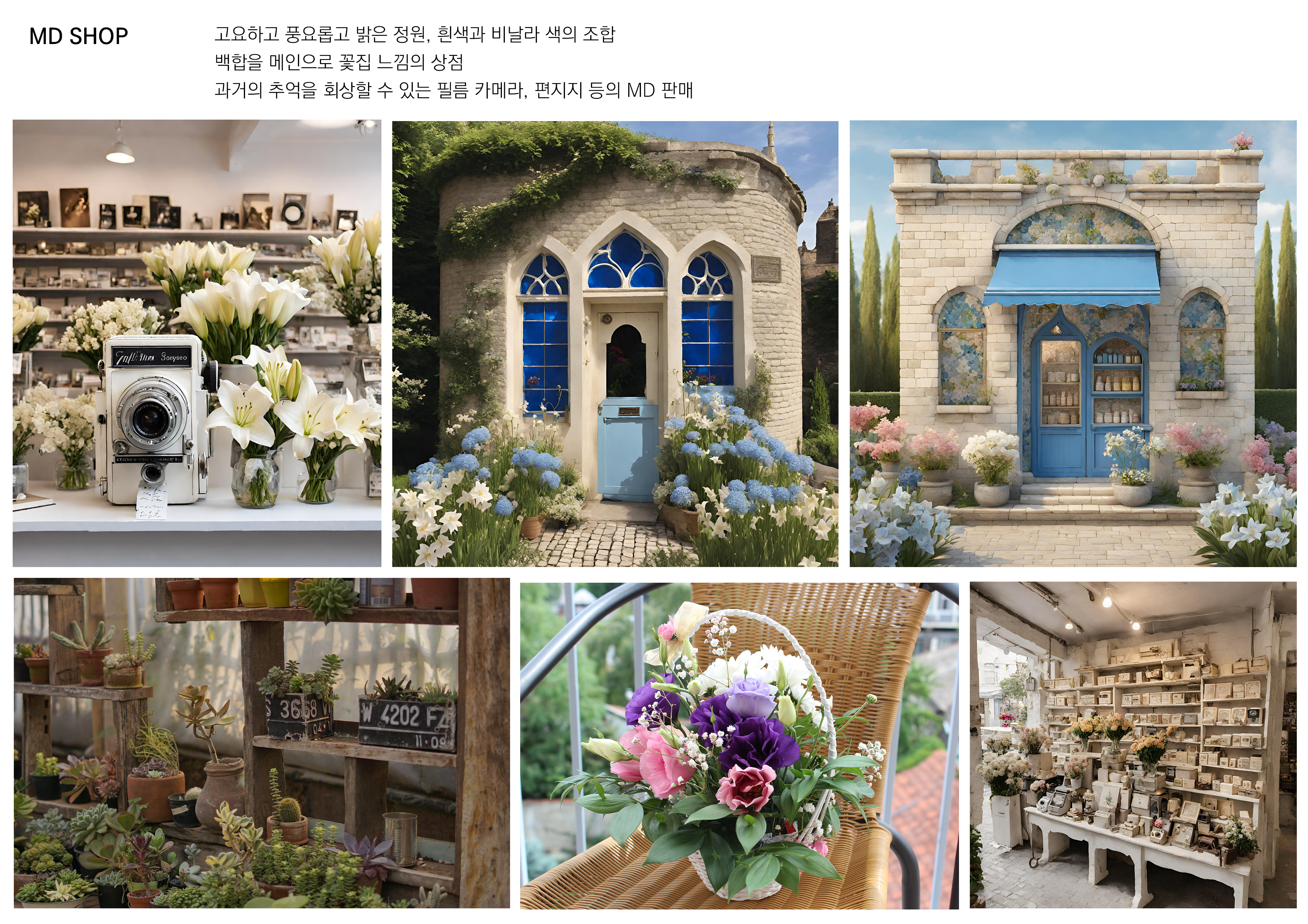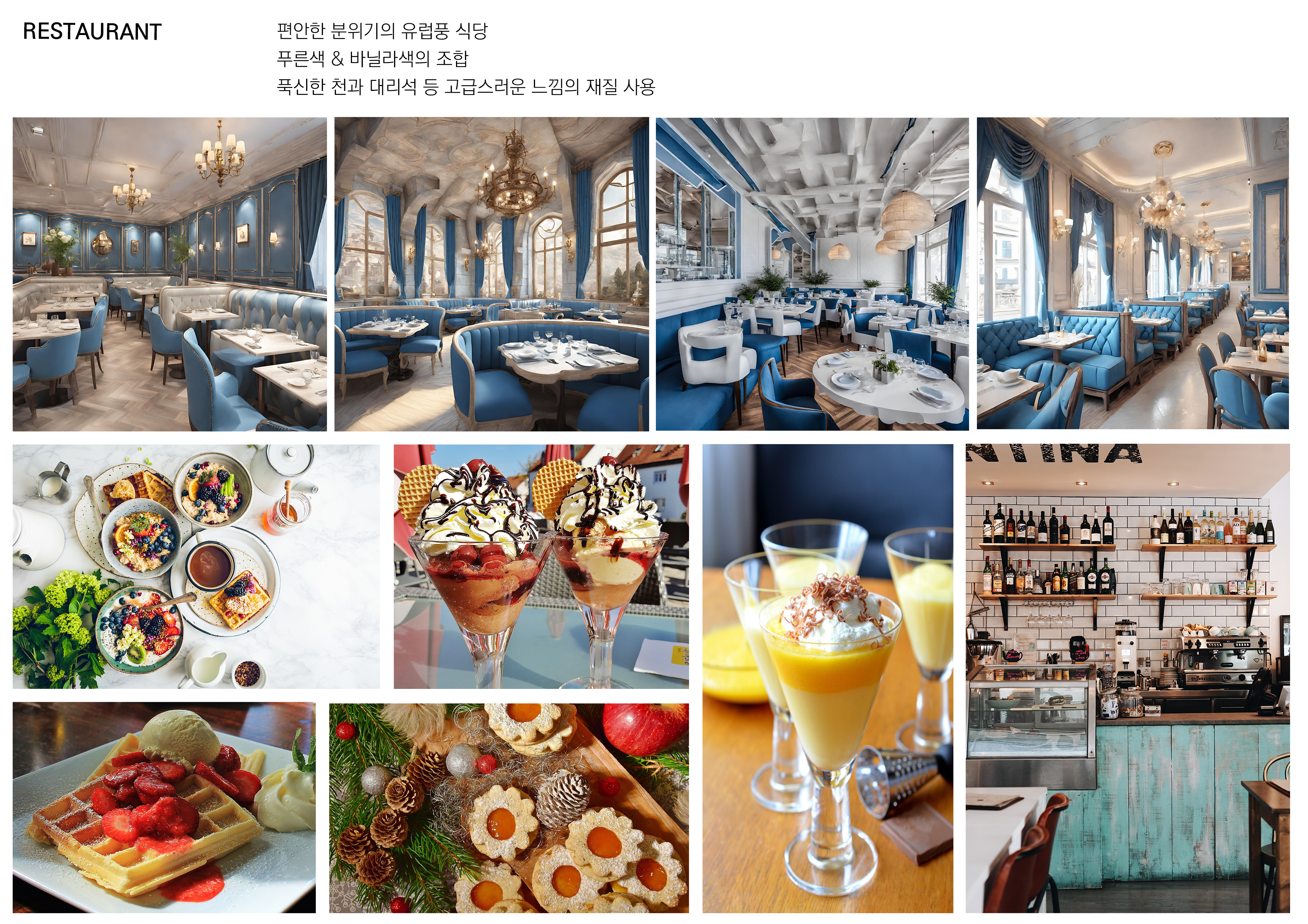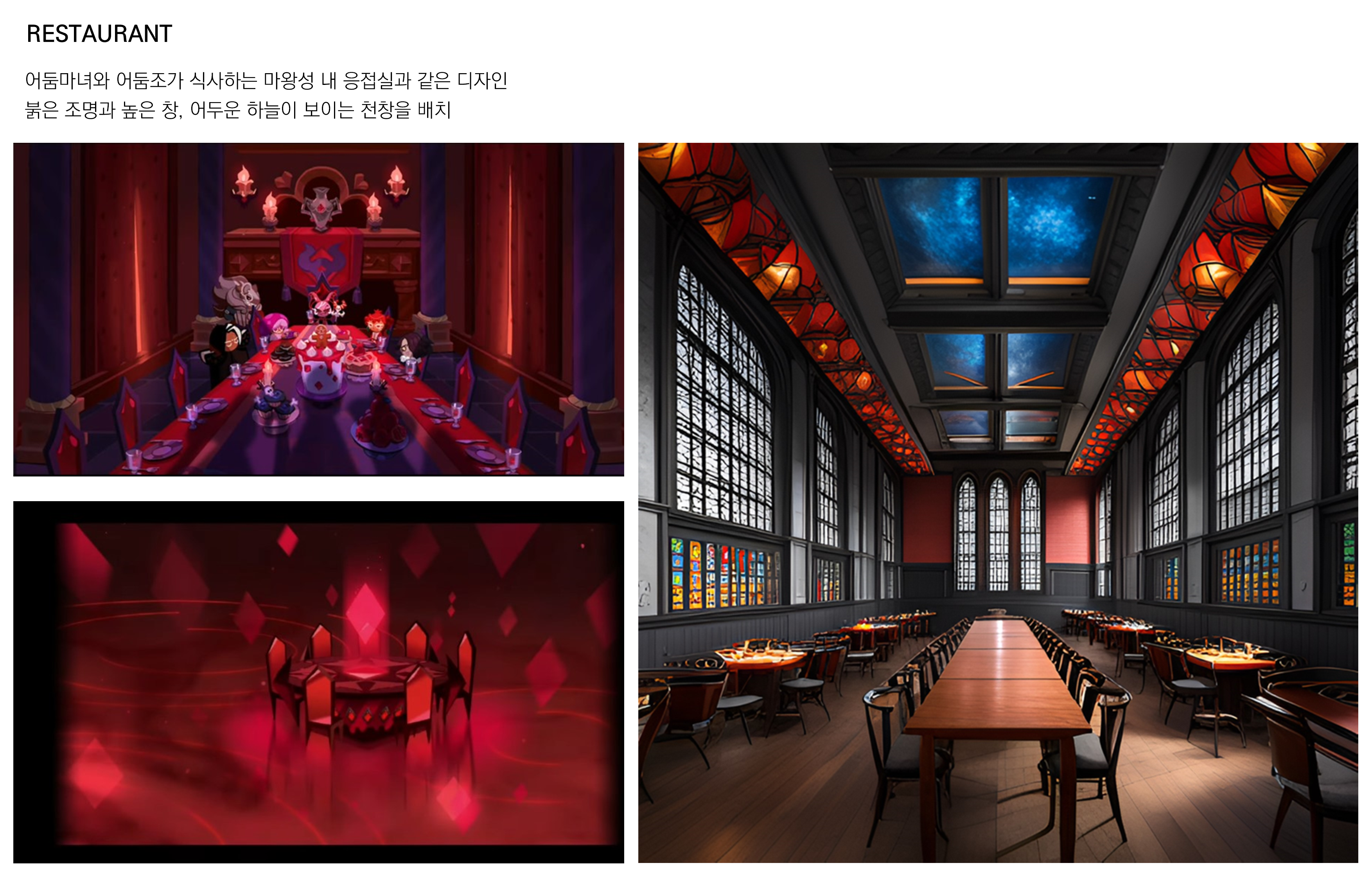 위 무드보드에 사용된 대부분의 실내 및 실외 인테리어 이미지는 AI 이미지를 활용하였다. 서로 다른 왕국을 표현하고 있는 4개의 테마 구역과 중앙 구역이 실제 구현된다면 바라는 공간을 여러 이미지의 조합을 통해 표현해 보았다.