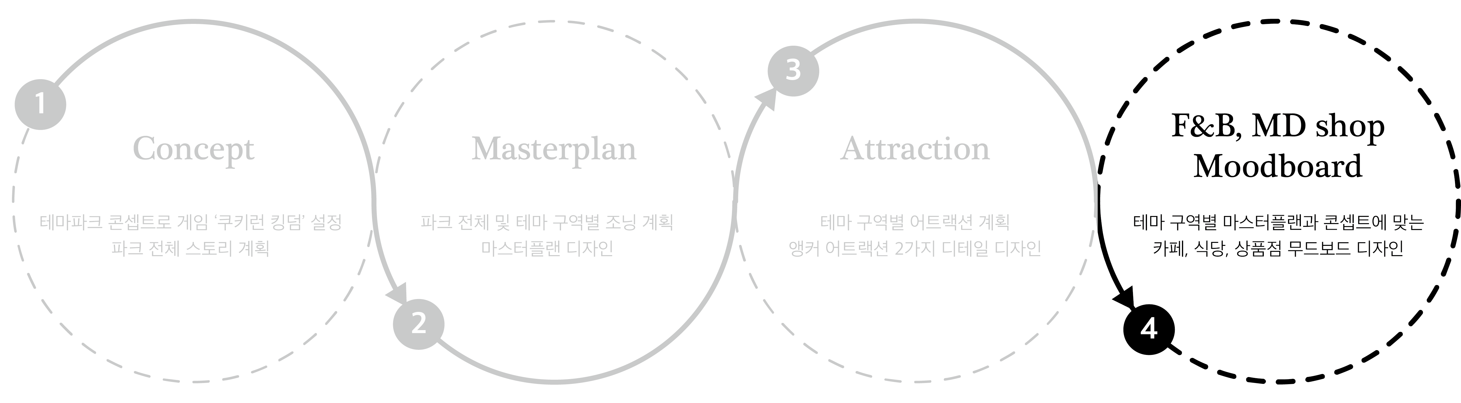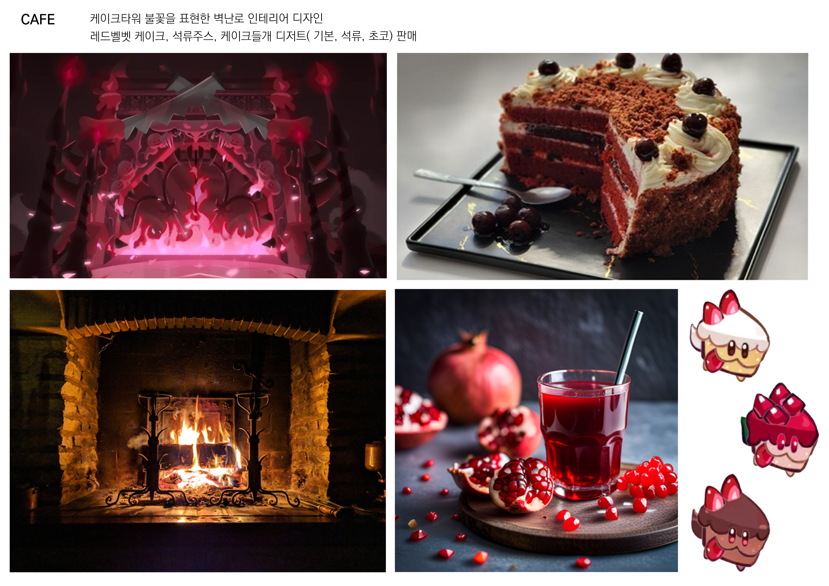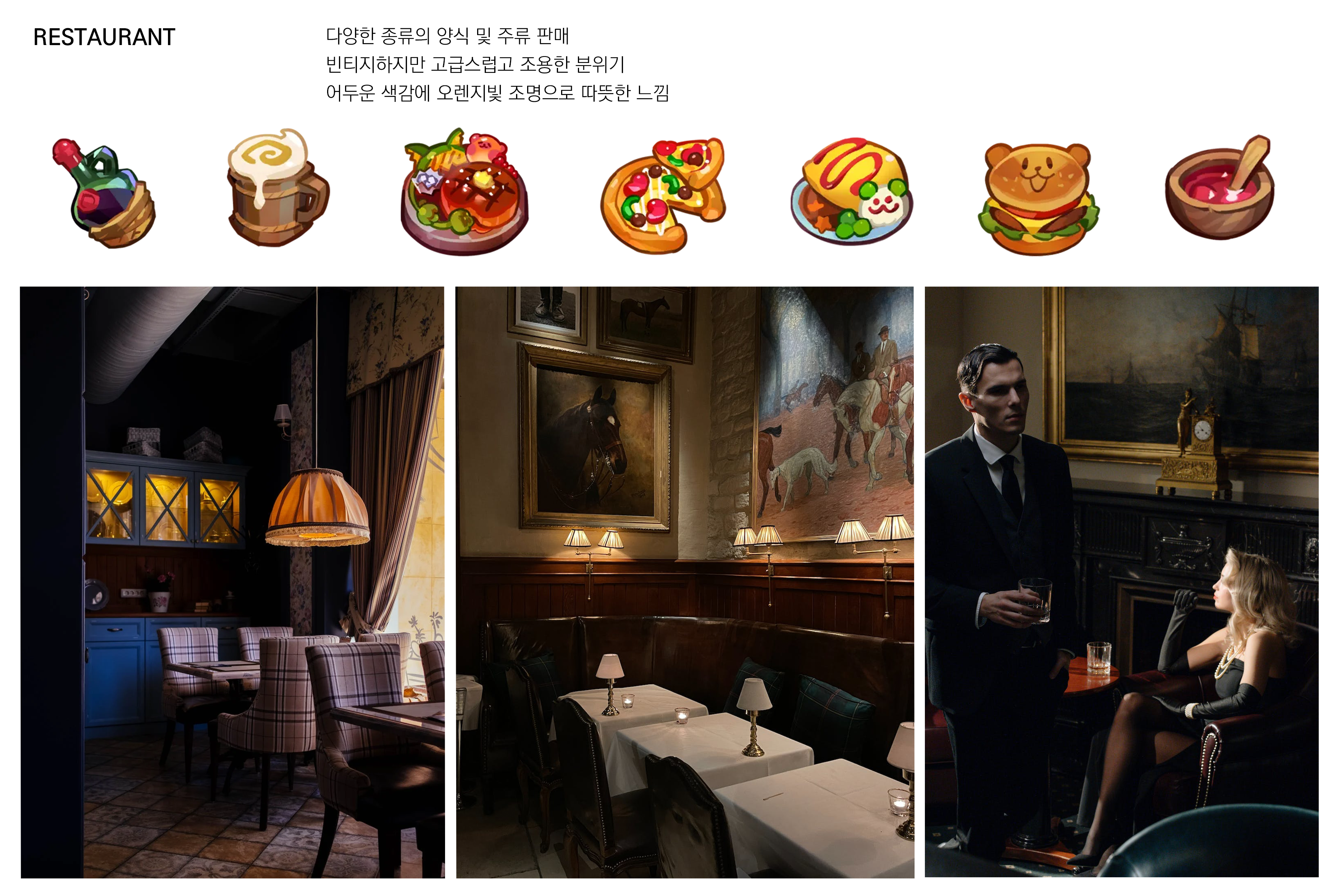 다섯번째 글인 이곳에서는 인게임 이미지 위주로 디자인했던 파크를 보다 현실적으로 느끼고 경험할 수 있는 무드보드를 소개하겠다. 재질, 음식 메뉴, 인테리어 디자인 등 여러 이미지가 하나로 모였을 때 그 공간의 실제와 같은 분위기를 느낄 수 있다.