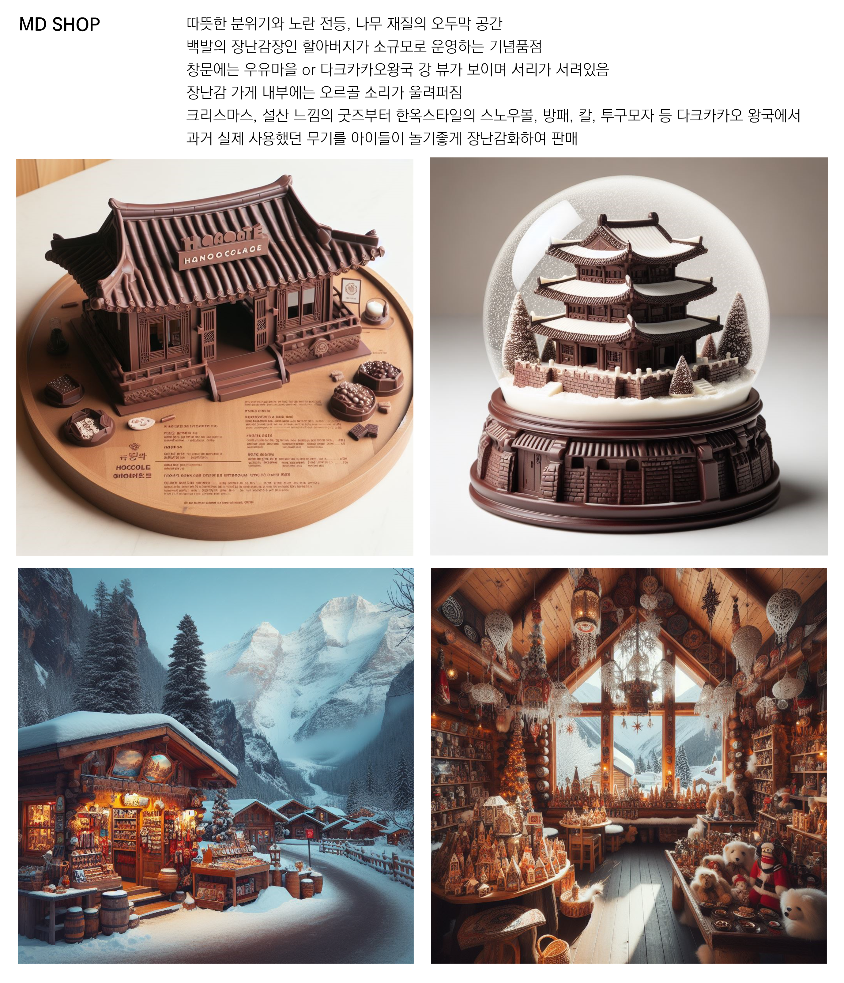 우유마을의 서브 MD샵에는 다크카카오 구역의 방문객들이 입장, 퇴장 시에 보는 중요한 공간이니 만큼 아기자기한 오두막 건물의 기념품점이다. 우유 마을에 오래살던 장난감 장인 할아버지가 운영하는 가게로 알프스 마을 언덕의 잠깐 추위를 녹일 수 있다.