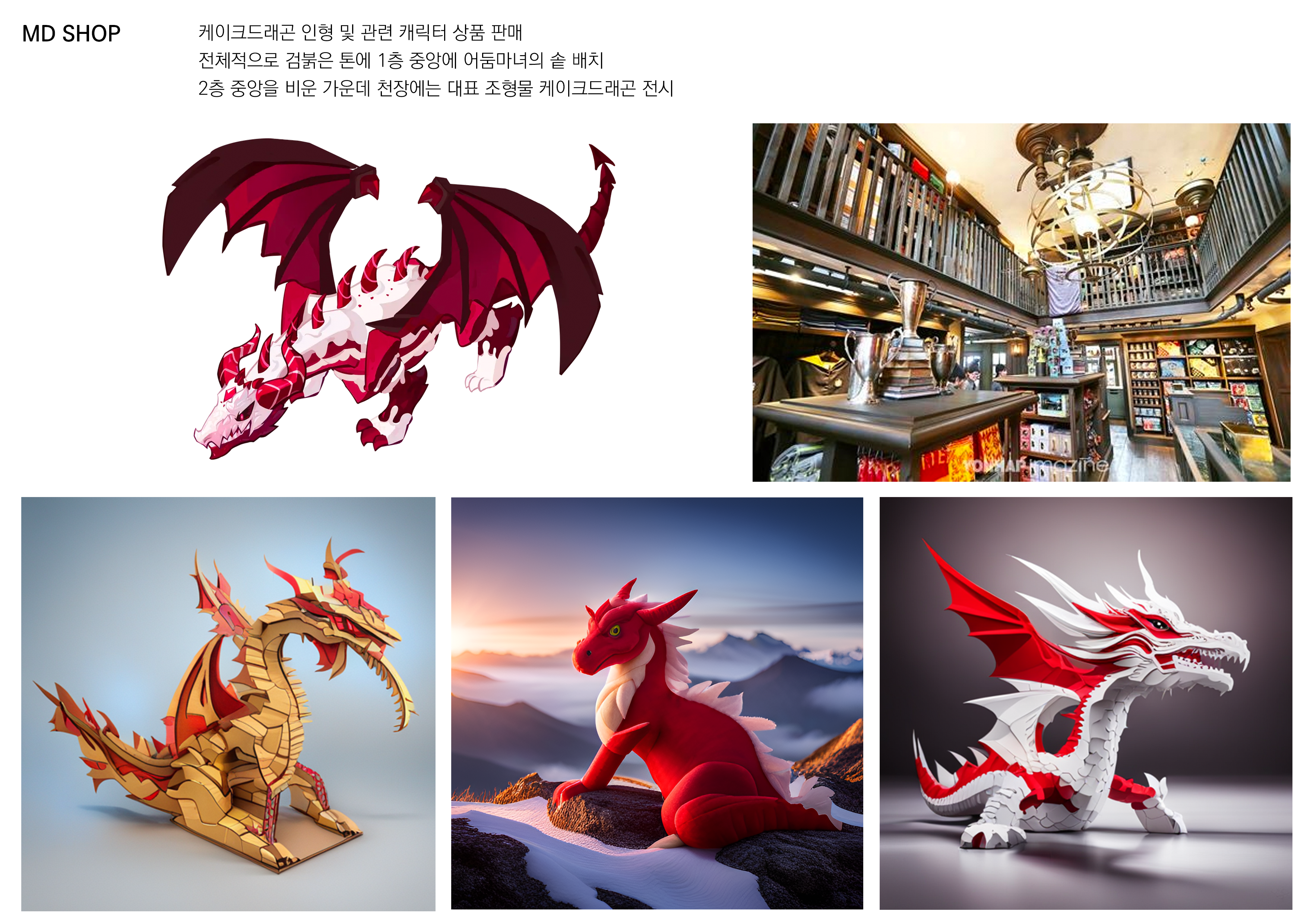 2층으로 이루어진 MD샵은 어둠마녀의 비밀 장소처럼 보이며 중앙 천장에는 대표 조형물인 케이크 드래곤이 전시되어 있다. 그 아래로는 수상해보이는 어둠마녀의 솥이 배치되어 있어 다양한 MD 상품을 구경하면서 동시에 어둠마녀의 비밀 장소를 탐험하는 기분을 느낄 수 있다.