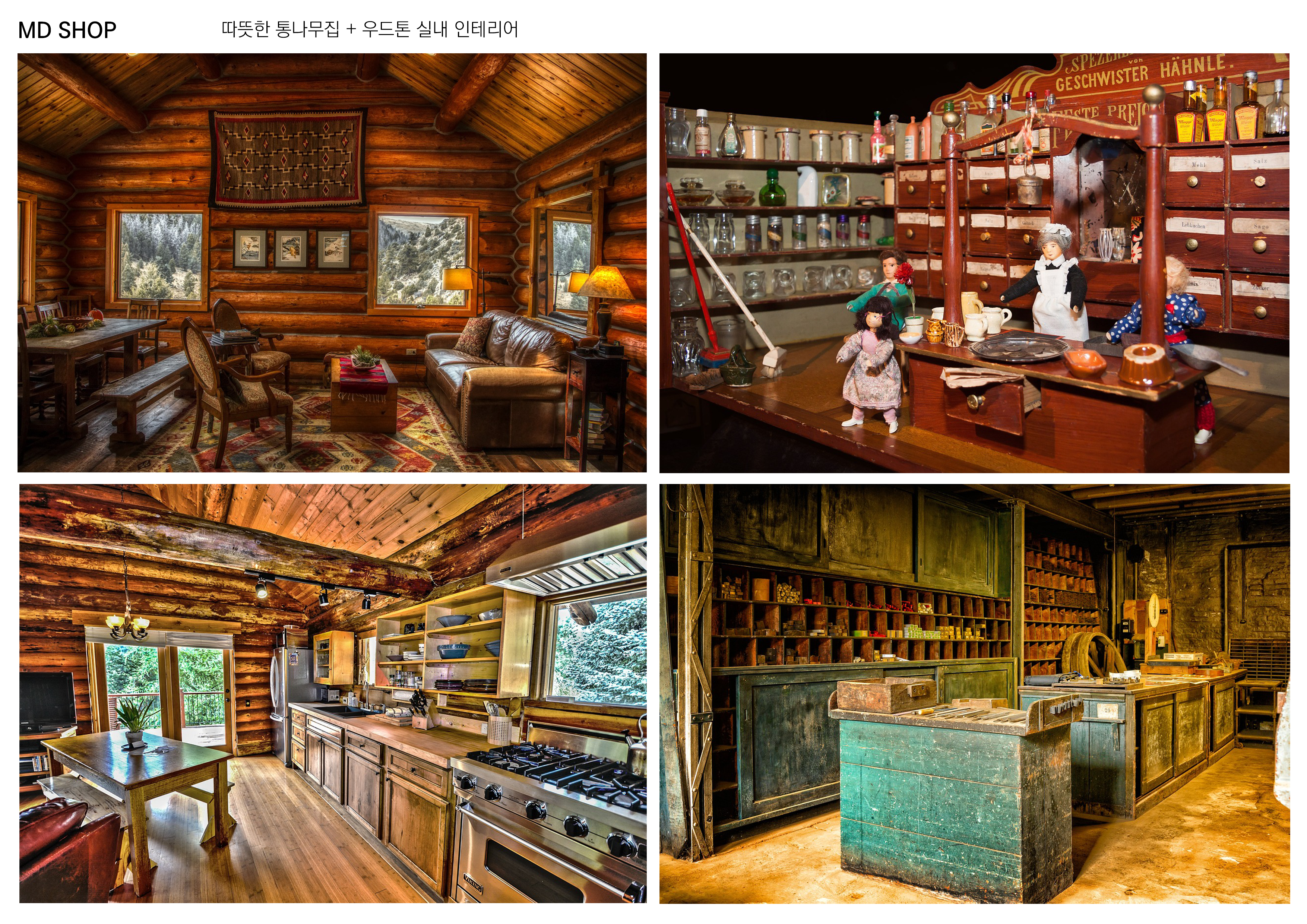 게임 생산 시설물 중 물건을 만드는 가장 기초적인 시설물이 통나무집이라는 것에 기인하여 따뜻한 통나무집에 우드톤 실내 인테리어를 시도했다. 파크의 가장 큰 기념품점이 대부분 입구에 위치하는 것을 고려하여, 방문객들이 입/퇴장 시 방문할 수 있도록 큰 규모로 구성했다.