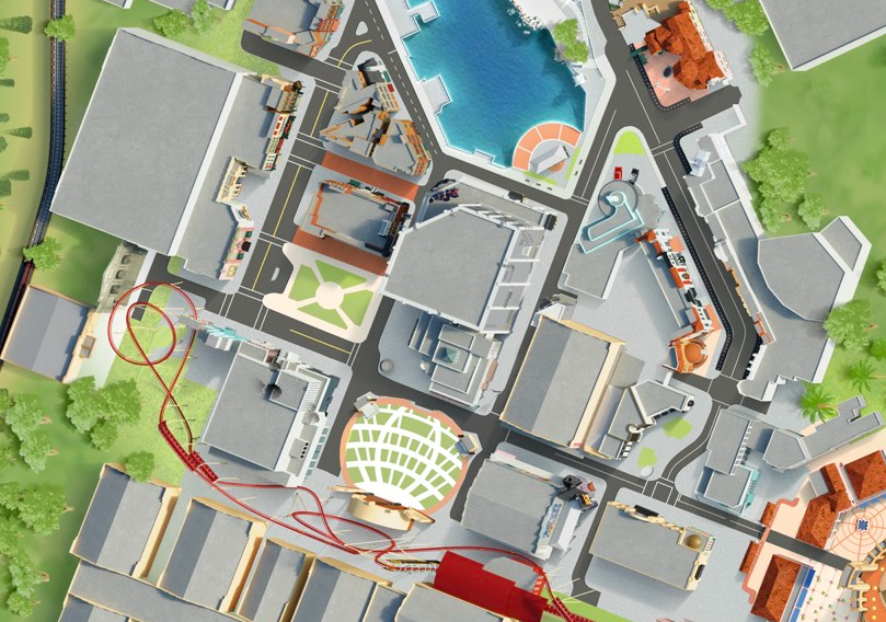 아일랜드 오브 어드벤처와 유니버설 스튜디오 플로리다는 가운데 호수를 두고 순환형 동선을 구성하고 있는 유사성이 있지만, 세부적으로 봤을 때 차이가 있다. 똑같이 순환형이지만 구역과 구역 사이를 다리 등으로 연결하거나 간판을 이용해 구역 구분을 확실하게 한 아일랜드 오브 어드벤처와 달리 유니버설 스튜디오 플로리다는 큰 길이 계속 이어지면서 구역을 연결하는 형태로 구성되어 있다. 이는 위성 사진 혹은 가이드맵을 보면 더 확실하게 알 수 있다.