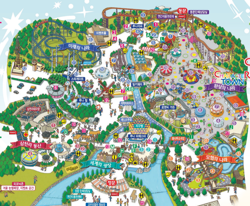 개장 당시에는 환상의 나라였던 구역이다. 회전목마와 같은 클래식 플랫라이드가 주로 설치되어 있어 동화적 분위기를 느낄 수 있는 구역이었다. 2010년대에 들어 외부 IP를 적극적으로 도입하기 시작하며 캐릭터타운으로 탈바꿈하게 되었는데, <라바>, <또봇>, <구름빵> 등 주로 국내 캐릭터를 어트랙션에 입히고 있다.