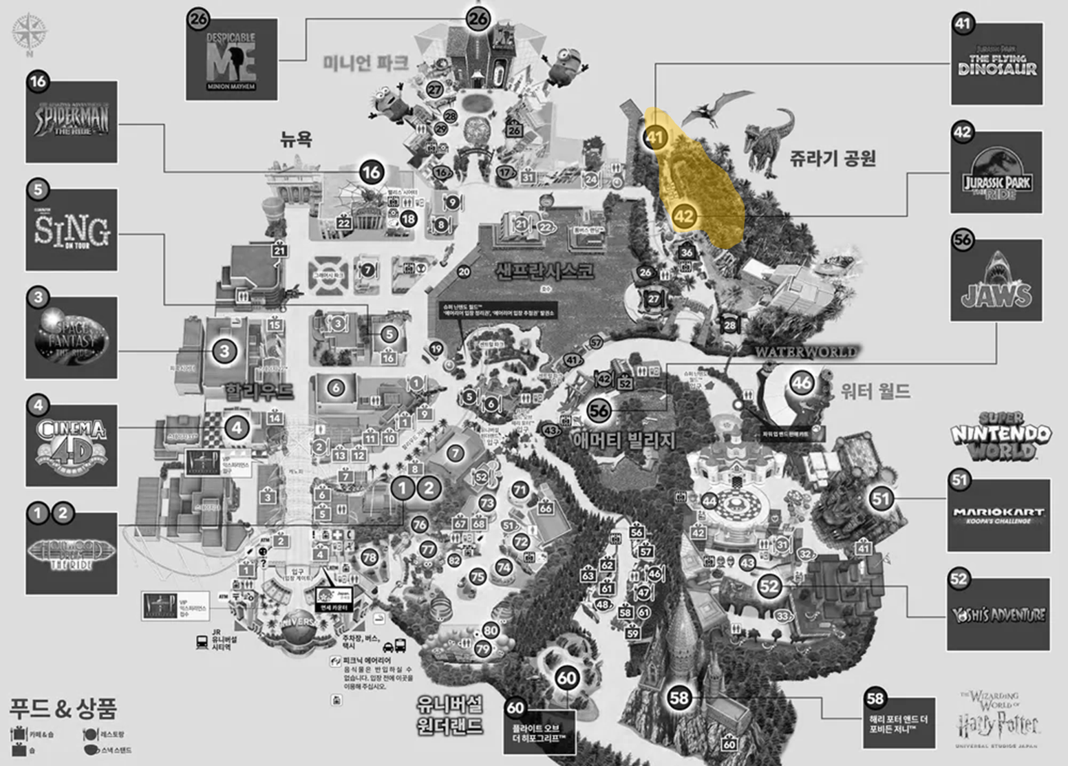 앵커 어트랙션으로 볼 수 있는 두 코스터 역시 파크 깊숙히 배치함으로써 관람자를 시각적으로, 청각적으로 파크 내부까지 끌어들이고 있다. 관람자들은 코스터의 장대한 레일의 모습과, 멀리 퍼지는 탑승객들의 비명소리에 이끌려 '미래의 나라'까지 이동하게 될 것이다.