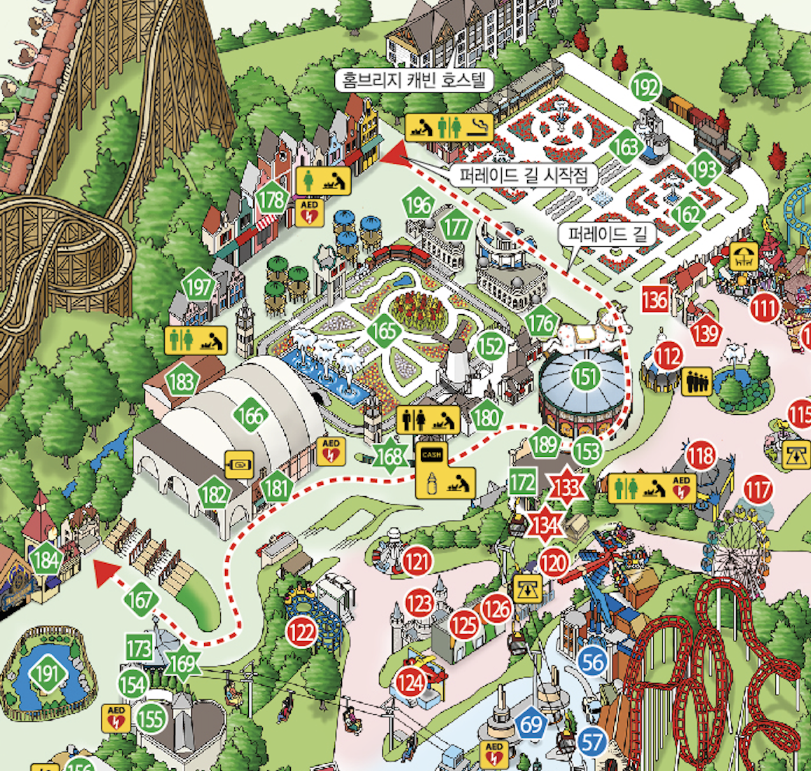 퍼레이드는 장미원과 홀랜드빌리지가 만나는 지점에서 시작되어 포시즌스 가든과 로얄 쥬빌리 캐로셀을 끼고 돌아 공연장을 지나며 카니발 광장에서 끝난다. (위 이미지의 빨간 점선 화살표를 따라가면 된다)