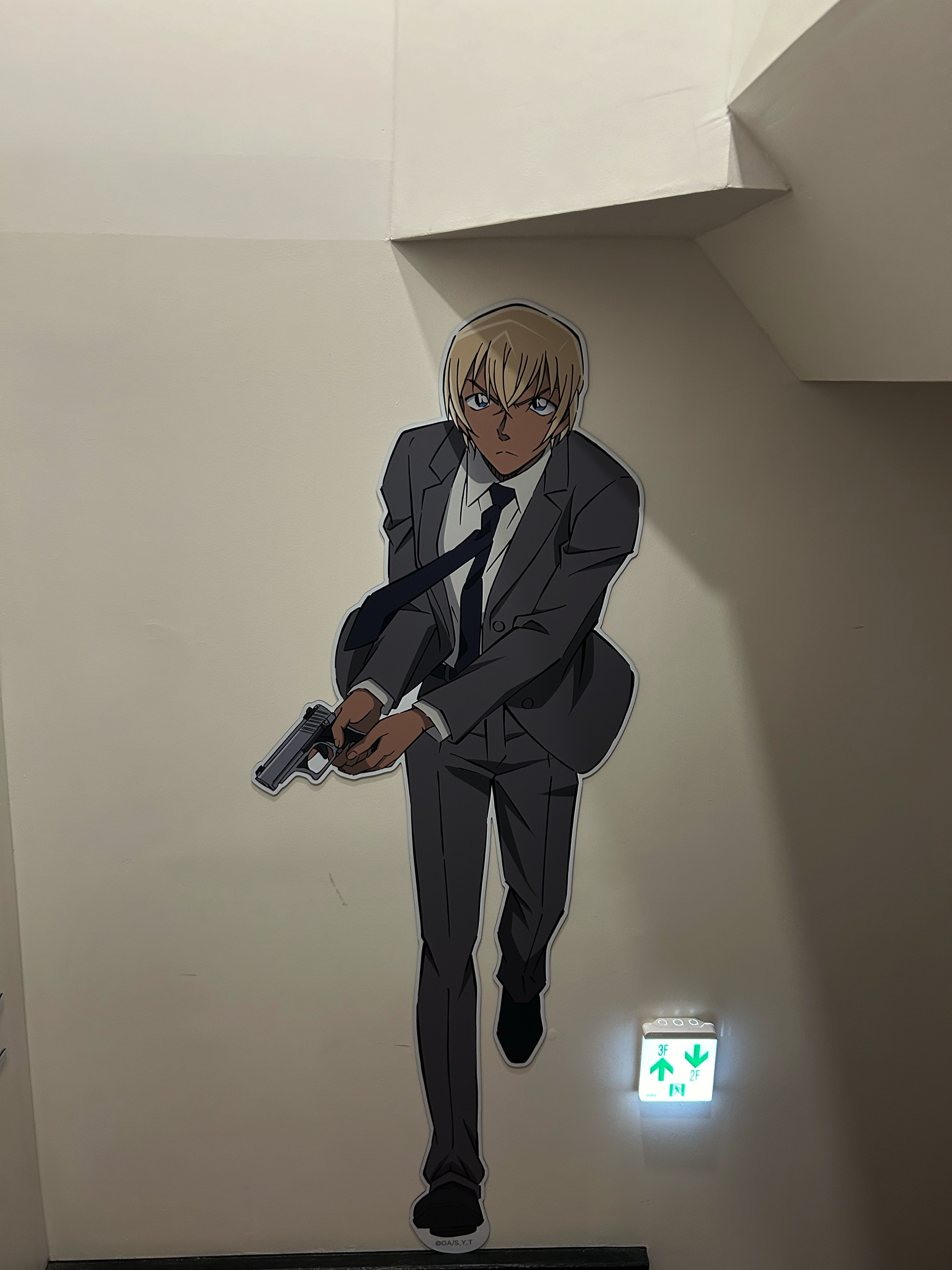 2층으로 내려가는 길에는 총을 들고 달려오는 공안 경찰 안기준과 FBI 이상윤 등의 등장인물이 계단 옆 벽면에 그려져 있다.