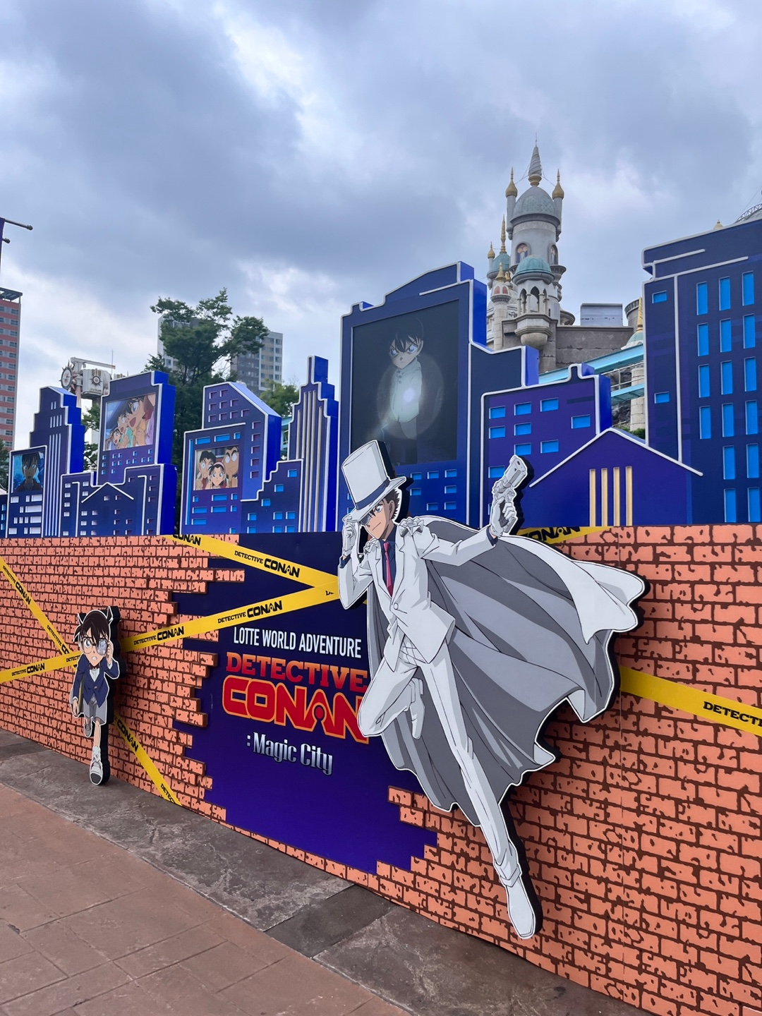 명탐정 코난 포토존은 대부분 야외 매직아일랜드 구역에 위치해있었다. 특히 매직캐슬로 이어지는 브릿지 양쪽에 이번 콜라보의 콘셉트인 매직 시티 홍보 깃발이 걸려있었다. 다만 에스컬레이터에 내려가기 전의 브릿지에는 삼바 페스티벌 배너만이 걸려있었고, 에스컬레이터에서 내리자마자부터 명탐정 코난 콜라보가 시작된다는 느낌이 확 들었다.