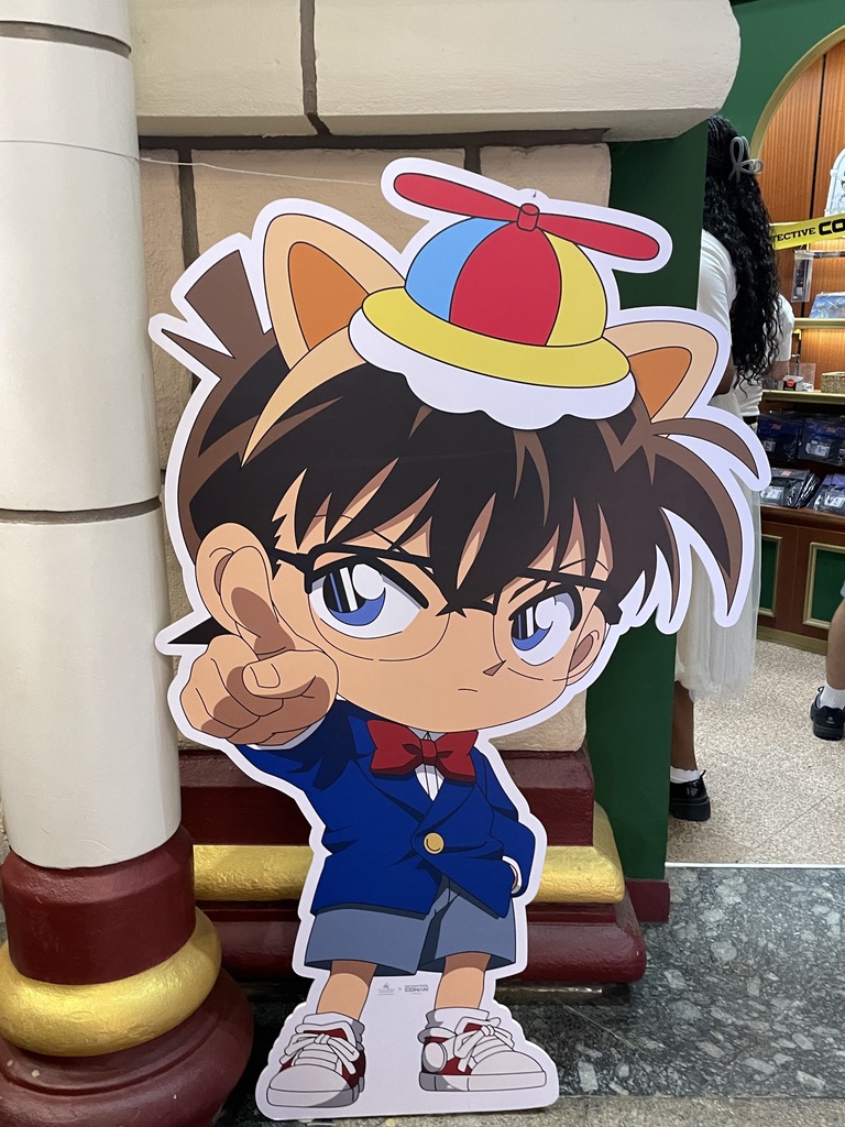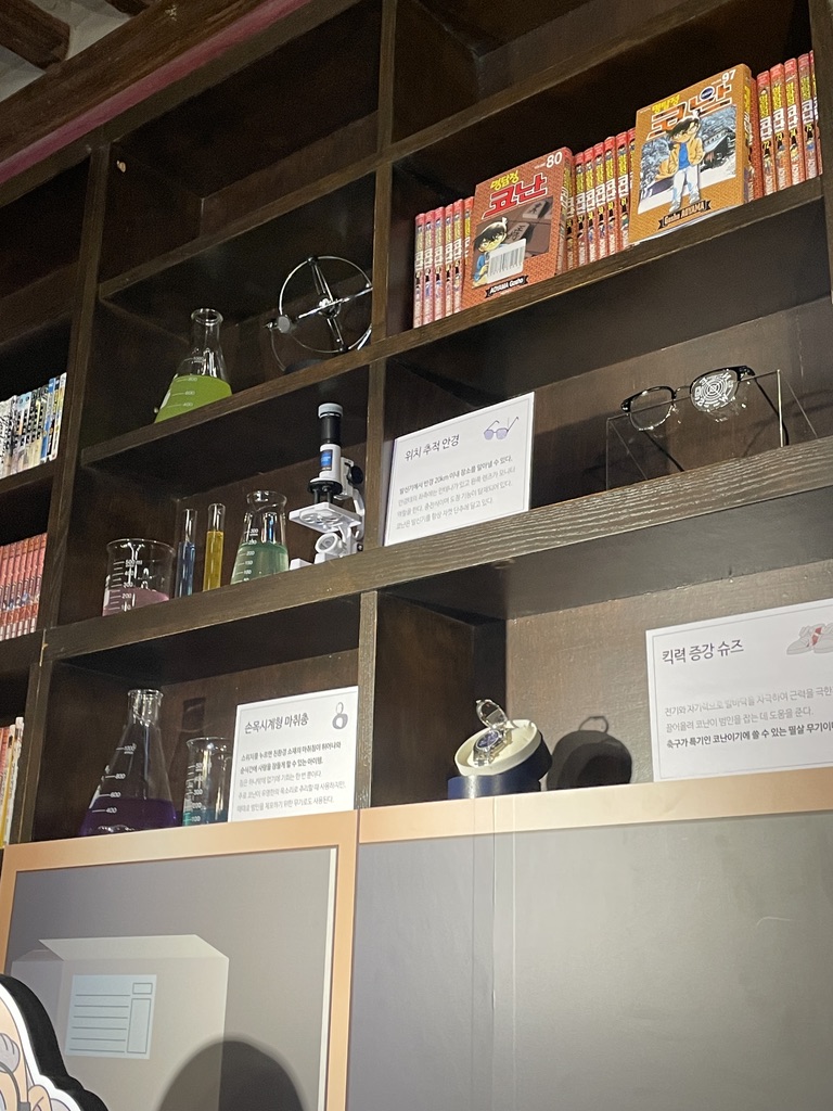 선반장은 왜 반만 실사고 반은 시트지인가. 이 정도는 코난 세계관을 설명하는 내용으로 더 채우거나 아래에서 판매하는 MD들을 전시하는 데 사용해도 좋았을 것 같다.
