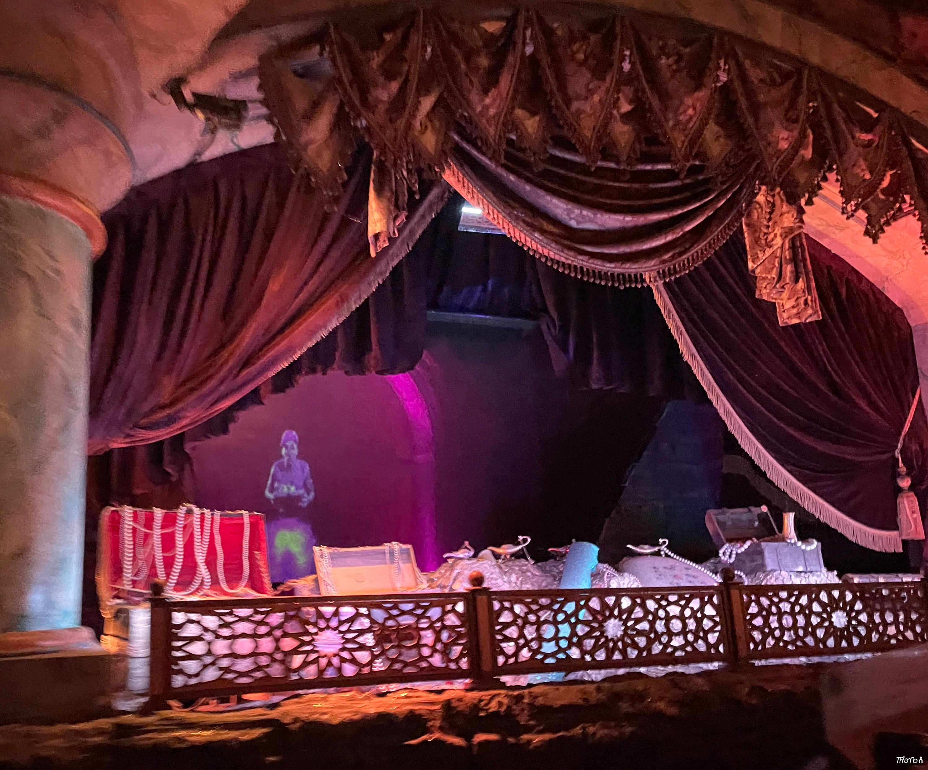 비클이 출발하고 동굴 입구에서 해골들이 신밧드를 언급하며 앞으로의 모험에 대해 암시하며 어트랙션의 시작을 알린다. 비클이 회전하며 어두운 동굴 속으로 낙하한다. 여러 차례의 번쩍임에 이어 나타난 붉은 조명의 동굴 내부에 들어오면 화신이 공주가 갇혀있다는 얘기를 하며 길을 알려준다. 이후 다시 한 번 낙하를 하면 지니가 기다렸다는 듯이 맞이한다.